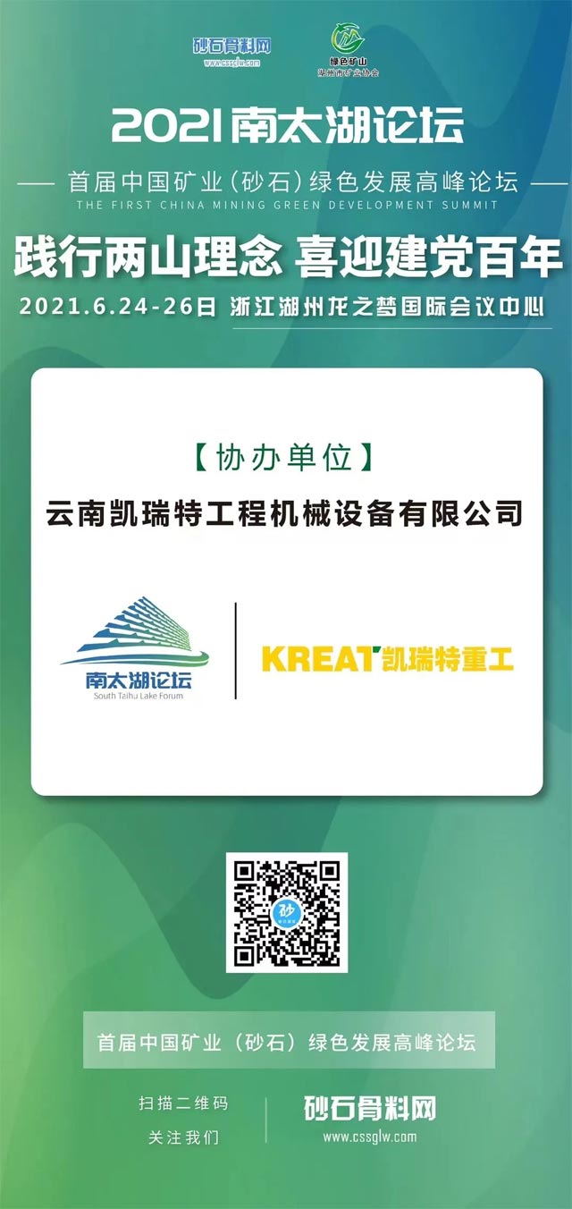 2021年6月24-26日,砂石骨料網(wǎng)與湖州市礦業(yè)協(xié)會聯(lián)手在“上有天堂、下有蘇杭、天堂中央、湖州風(fēng)光”美譽的湖州龍之夢國際會議中心召開“南太湖論壇-首屆中國礦業(yè)(砂石)綠色發(fā)展高峰論壇”。凱瑞特重工科技有限公司作為本次論壇唯一一家移動破碎篩分裝備制造協(xié)辦企業(yè),其產(chǎn)品廣泛應(yīng)用于退坑礦為良田、綠色礦山修復(fù)、尾礦處理等固廢再生領(lǐng)域。未來,凱瑞特重工將一如既往,在政策及大趨勢的推動下,與萬千企業(yè)一起致力于砂石企業(yè)的環(huán)保、可持續(xù)發(fā)展,并為“變廢為寶,創(chuàng)建美好家園”的企業(yè)使命不斷發(fā)力!
