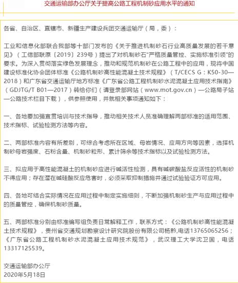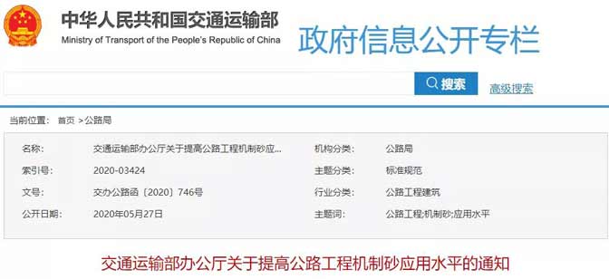 近日機(jī)制砂行業(yè)迎來(lái)新曙光,為解決中國(guó)河砂緊缺的局面,2020 年5月27日交通運(yùn)輸部發(fā)布《交通運(yùn)輸部辦公廳關(guān)于提高公路工程機(jī)制砂應(yīng)用水平的通知》,力推機(jī)制砂應(yīng)用于全國(guó)公路工程應(yīng)用!并對(duì)對(duì)機(jī)制砂石質(zhì)量給出具體參考標(biāo)準(zhǔn),各地可結(jié)合實(shí)際情況在應(yīng)用過(guò)程中制定實(shí)施細(xì)則,不斷加強(qiáng)機(jī)制砂生產(chǎn)與應(yīng)用過(guò)程中的質(zhì)量管控,確保機(jī)制砂質(zhì)量。