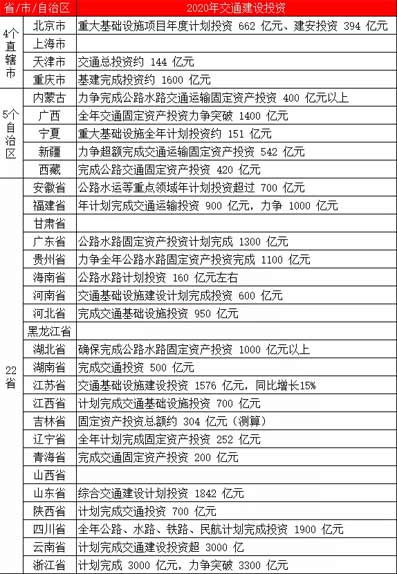 目前,全國(guó)已有 27 個(gè)省(自治區(qū))公布了 2020 年交通基建固定資產(chǎn)投資計(jì)劃,投資總額約為 26003 億元。